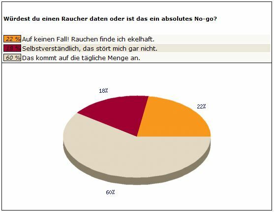 97 Prozent der befragten Nichtraucher empfinden Qualmerei beim Partner als störend: unangenehmer Geruch in Wohnung und Kleidung, fieser Geschmack beim Küssen, gelbe Zähne oder Finger … Kein Wunder, dass 36 Prozent der rauchenden Frauen und jedem vierten Mann das Rauchen peinlich ist. Christian Kirschey, Gründer und Geschäftsführer der Singlebörse bildkontakte.de: „Wir wollten wissen, wie die Chancen der Raucher auf dem Single-Markt stehen. Die meisten Frauen und Männer geben Rauchern nicht mal die Chance auf ein Kennenlernen.“