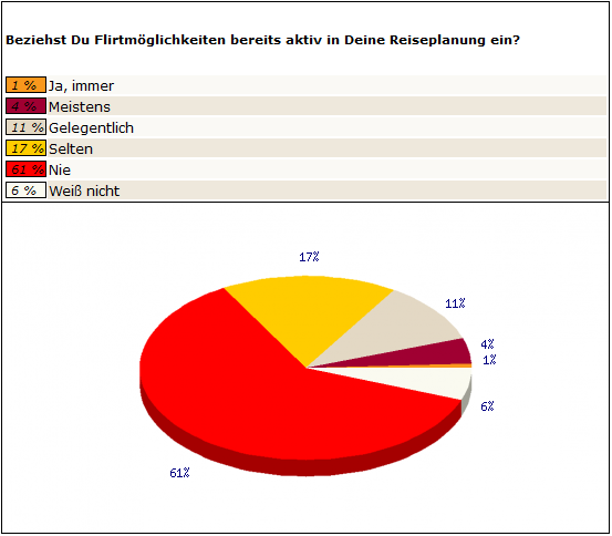 Für Frauen spielt der Urlaubsflirt eine geringere Rolle – nur 15 Prozent messen ihm einen besonderen Stellenwert bei, 80 Prozent halten Urlaubsromanzen für entbehrlich. Dennoch hatten innerhalb der letzten fünf Jahre 31 Prozent eine oder mehrere Urlaubsromanzen (Männer: 39 Prozent). „Dabei verlassen sich beide Geschlechter auf den Zufall“, erläutert Christian Kirschey, Geschäftsführer von bildkontakte.de. „Flirtchancen sind bei drei Viertel der Befragten kein Gegenstand der Reiseplanung.“